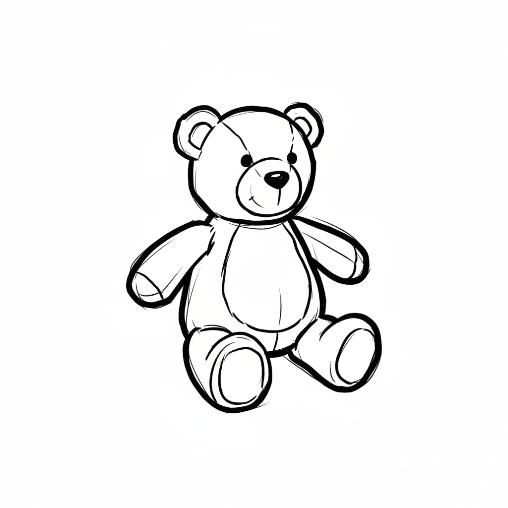 Sitzender Teddybär als Schwarz-Weiß-Strichzeichnung mit skizzenhaftem Stil.