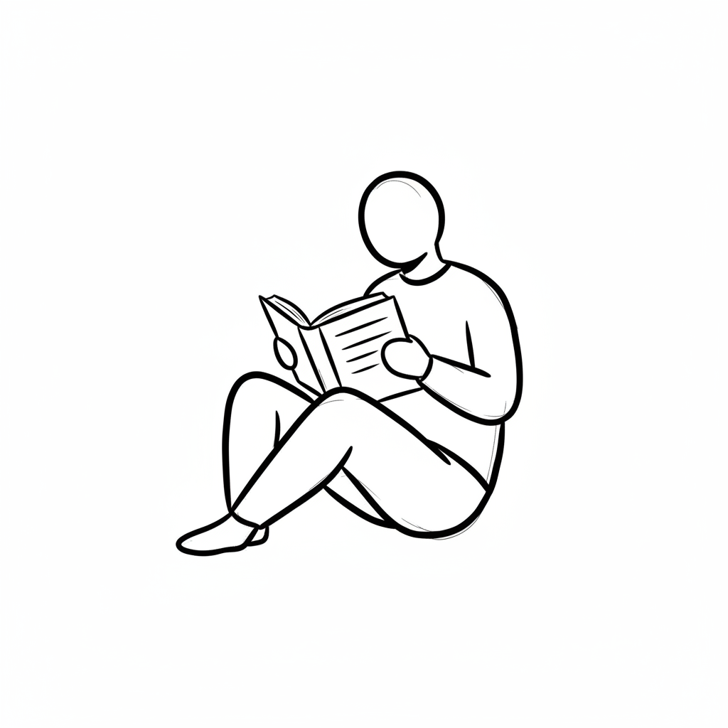 Strichzeichnung einer sitzenden Person, die ein Buch liest.