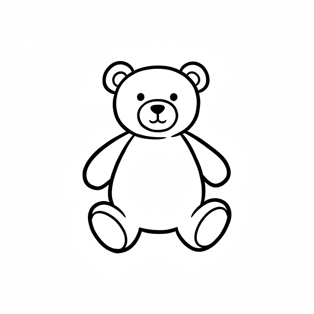 Einfache Schwarz-Weiß-Strichzeichnung eines sitzenden Teddybären auf weißem Hintergrund.