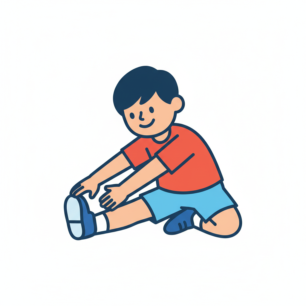 Ein lächelnder Cartoon-Junge dehnt sich sitzend und greift nach seinen Füßen.