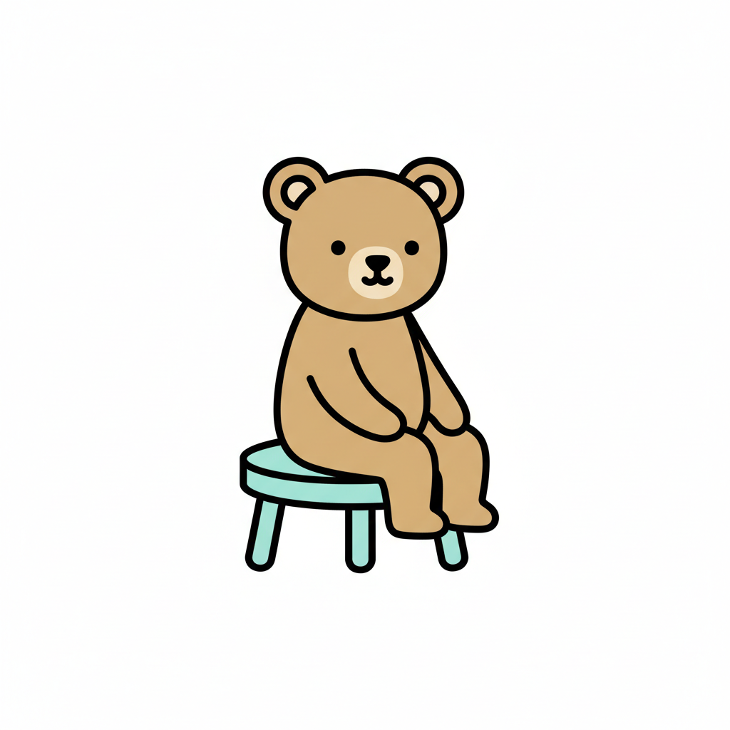 Niedlicher Cartoon-Bär sitzt auf einem kleinen blauen Hocker vor weißem Hintergrund.