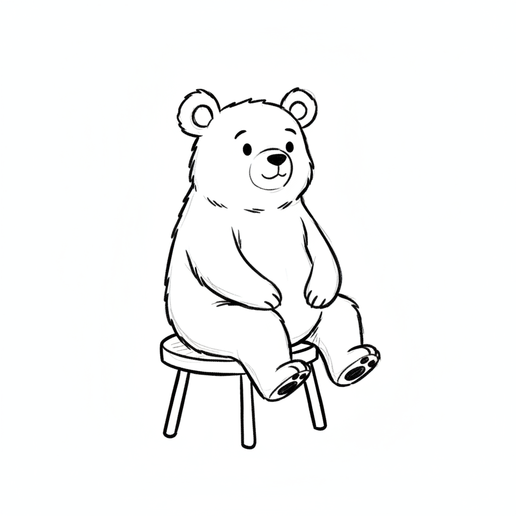 Niedlicher Cartoon-Bär sitzt auf einem Hocker, Schwarz-Weiß-Zeichnung.