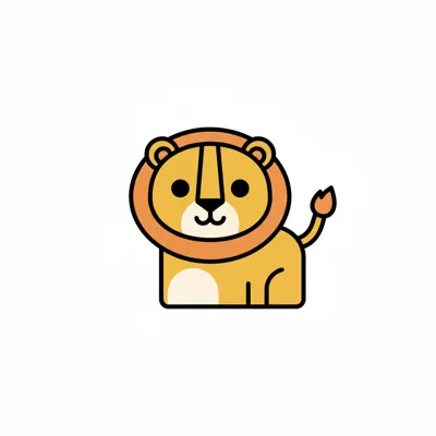 Niedlicher, stilisierter Cartoon-Löwe mit gelbem Fell und oranger Mähne, sitzend auf weißem Hintergrund.
