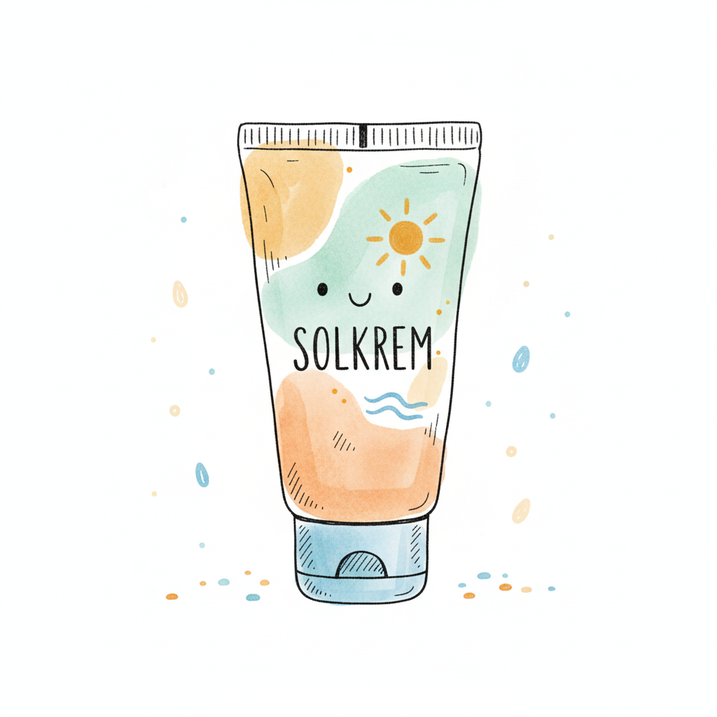 Niedliche, illustrierte Sonnencremetube mit lächelndem Gesicht und "SOLKREM"-Aufschrift im Aquarellstil.