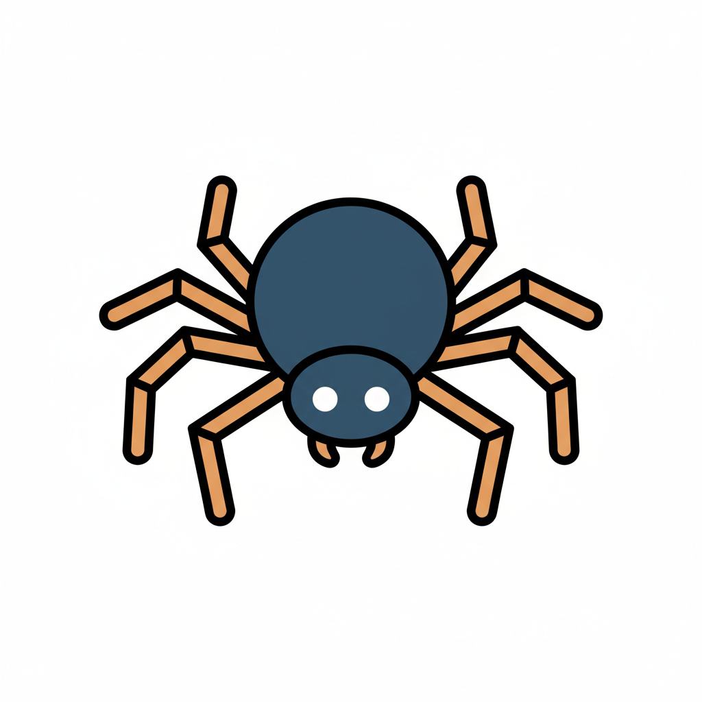 Eine cartoonhafte, braune Spinne mit großen Augen und acht Beinen.