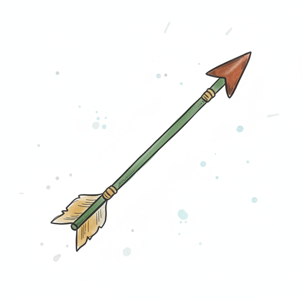 Ein handgezeichneter Pfeil mit grünem Schaft, brauner Spitze und gelben Federn auf weißem Grund.