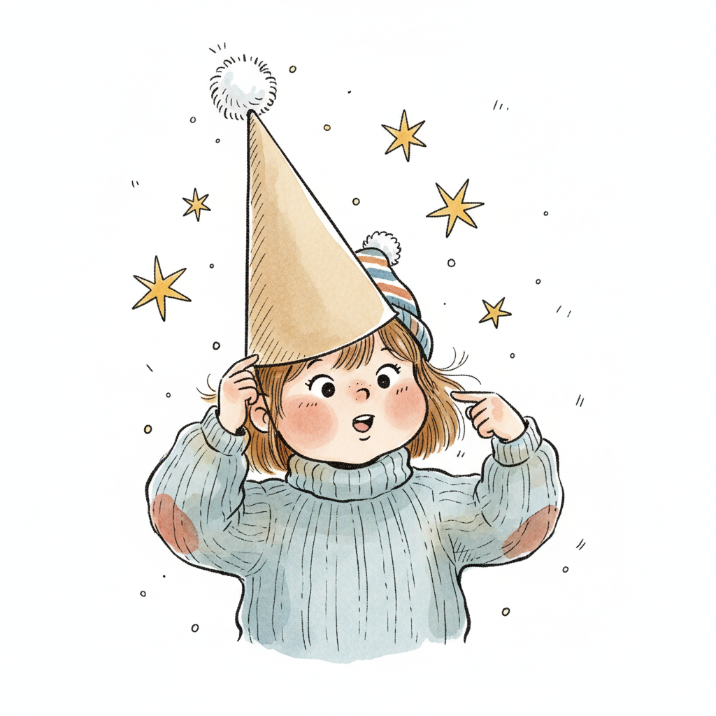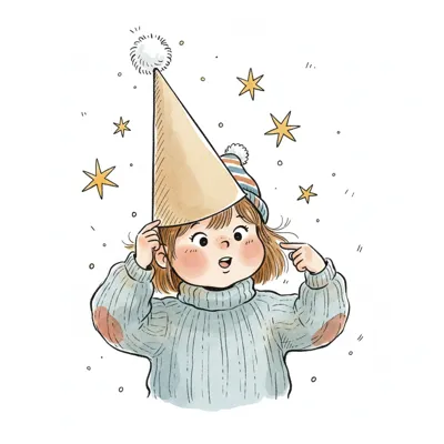 Niedliches Cartoon-Mädchen mit Partyhut und Sternen, überrascht und fröhlich.