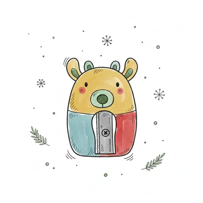 Niedlicher Cartoon-Spitzer in Form eines Rentiers oder Bären, umgeben von Schneeflocken und Blättern.