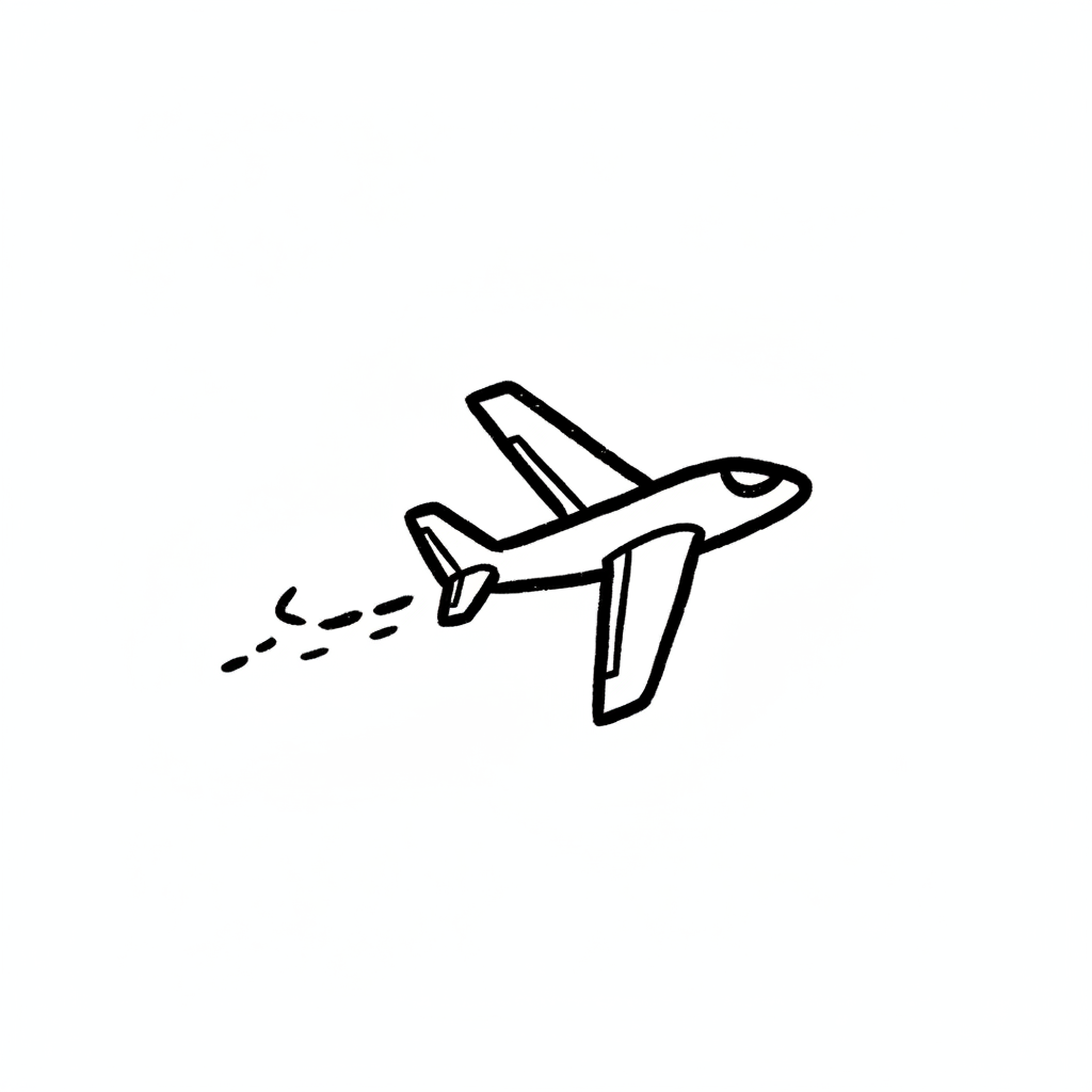 Schwarz-weiße Strichzeichnung eines Flugzeugs im Flug mit gestrichelter Spur.