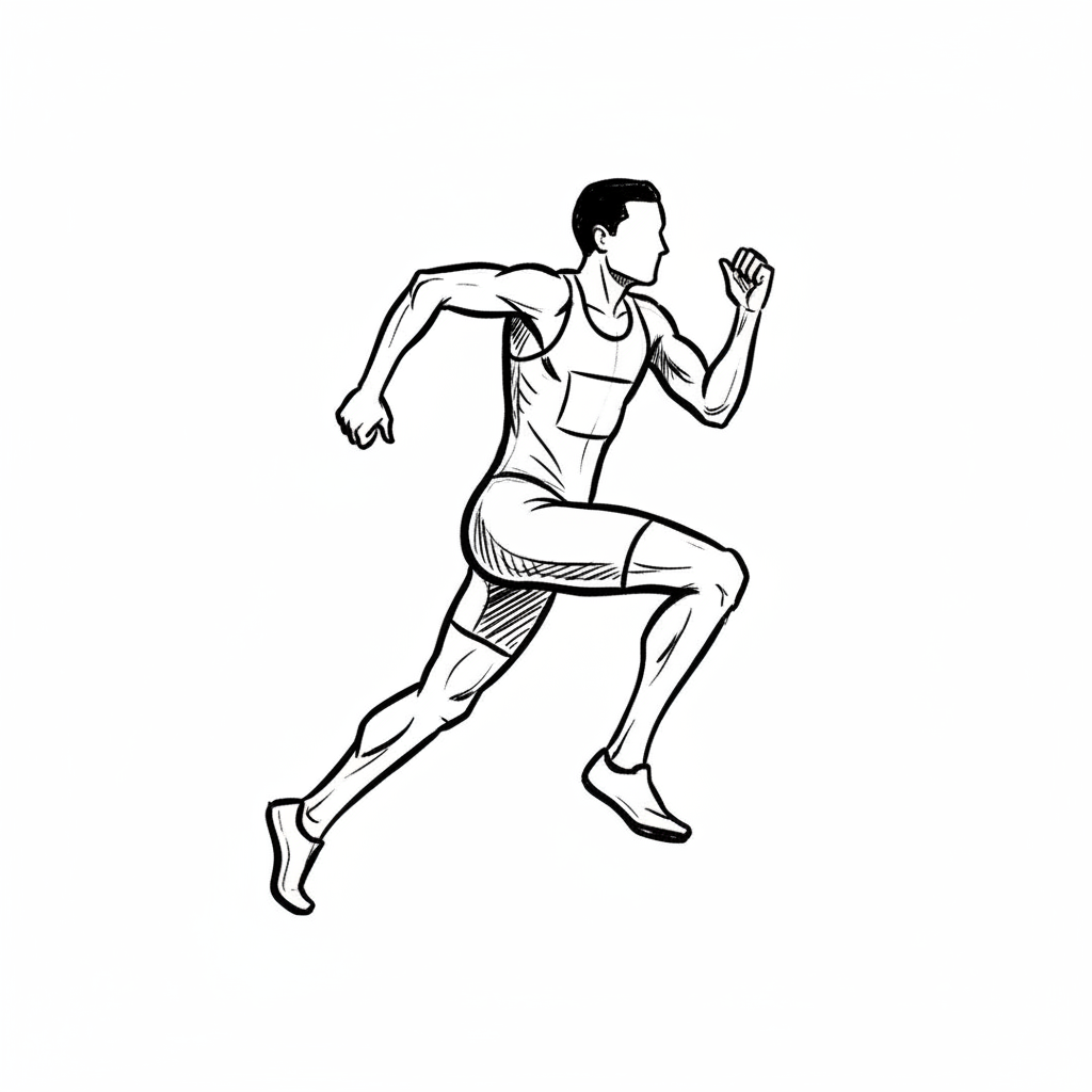 Schwarz-weiße Skizze eines Läufers in voller Bewegung, trägt Sportkleidung und Startnummer.