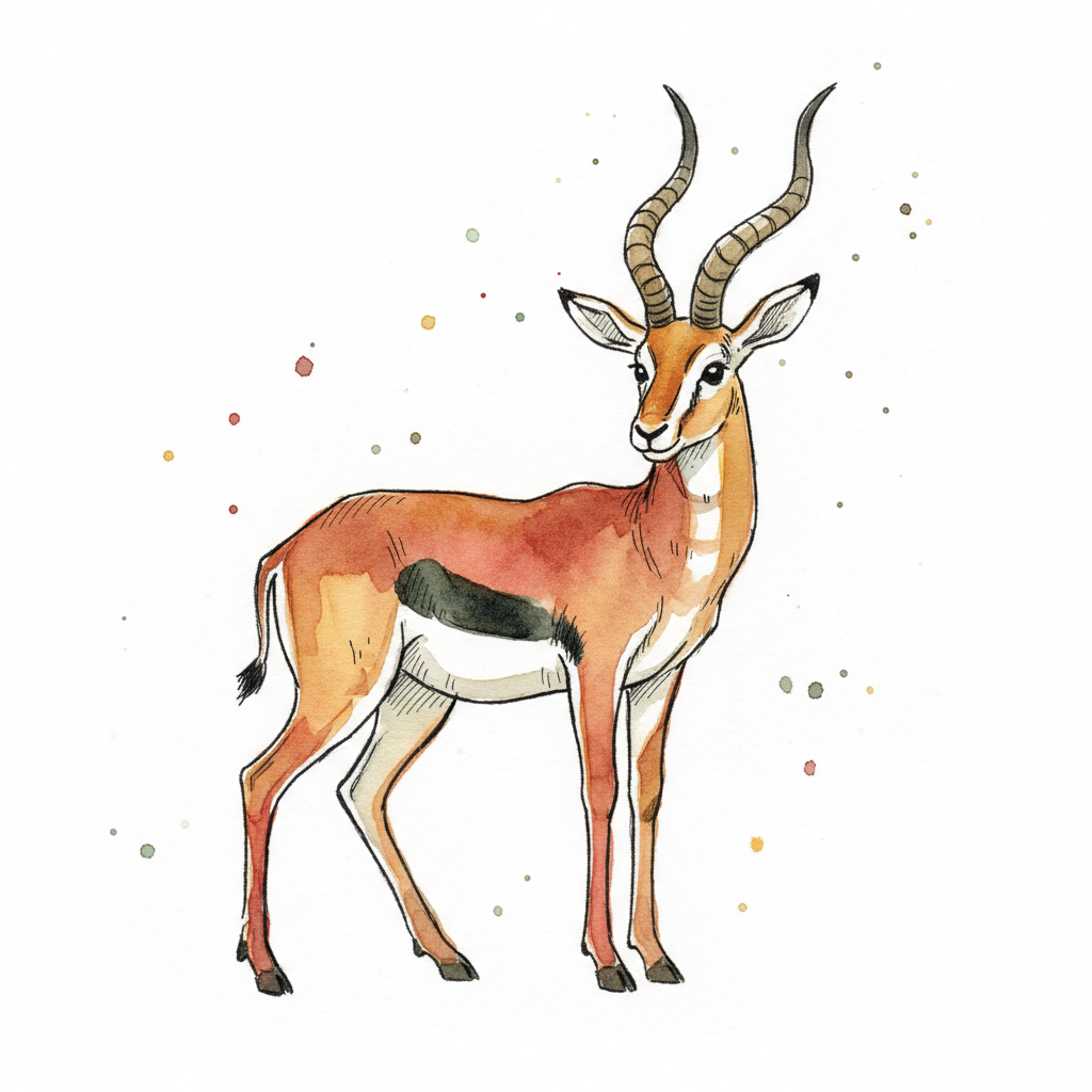 Aquarell einer Gazelle mit Hörnern, stehend auf weißem Grund mit Farbspritzern.