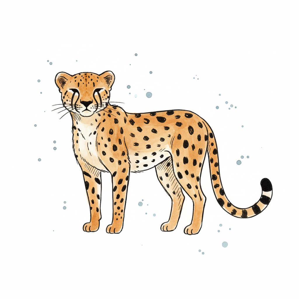 Illustration eines stehenden Geparden mit geschlossenen Augen auf weißem Hintergrund.