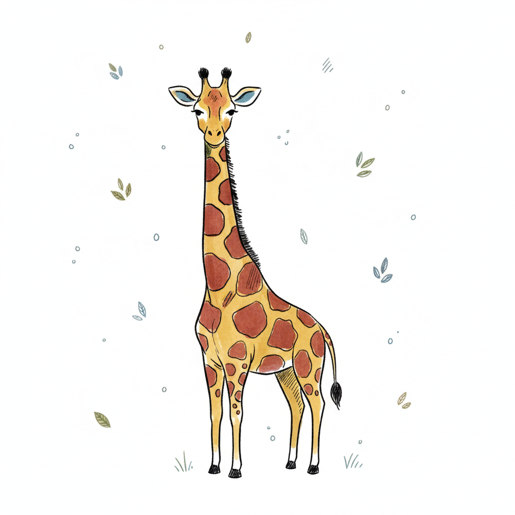 Niedliche Illustration einer stehenden Giraffe mit braunen Flecken auf weißem Hintergrund.