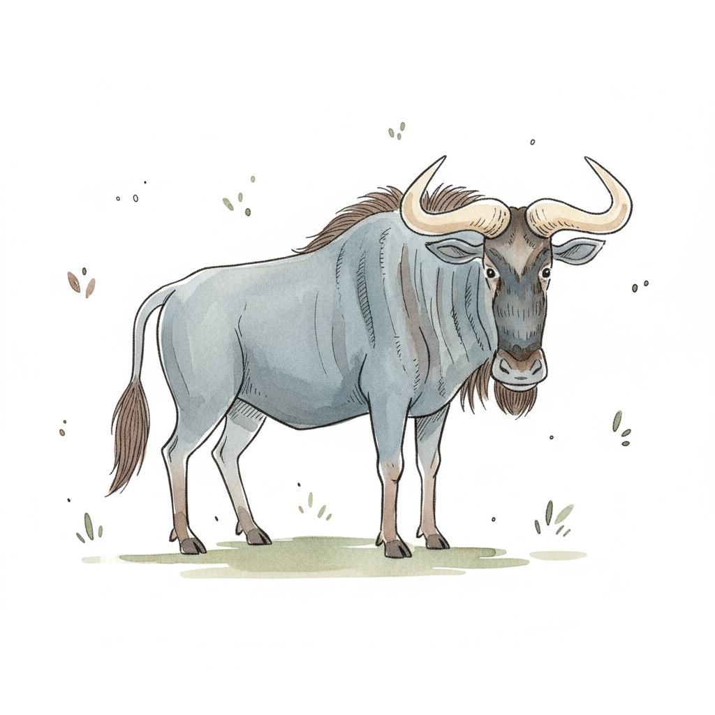 Aquarell-Illustration eines Gnus mit Hörnern und dunklem Gesicht, stehend auf Gras.