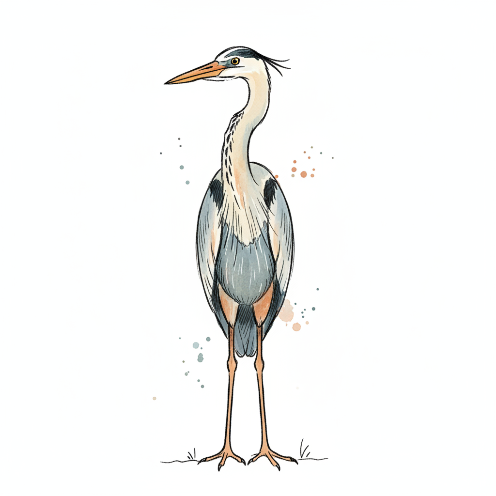 Aquarell-Illustration eines stehenden Reihers mit langen Beinen und Schnabel auf weißem Grund.