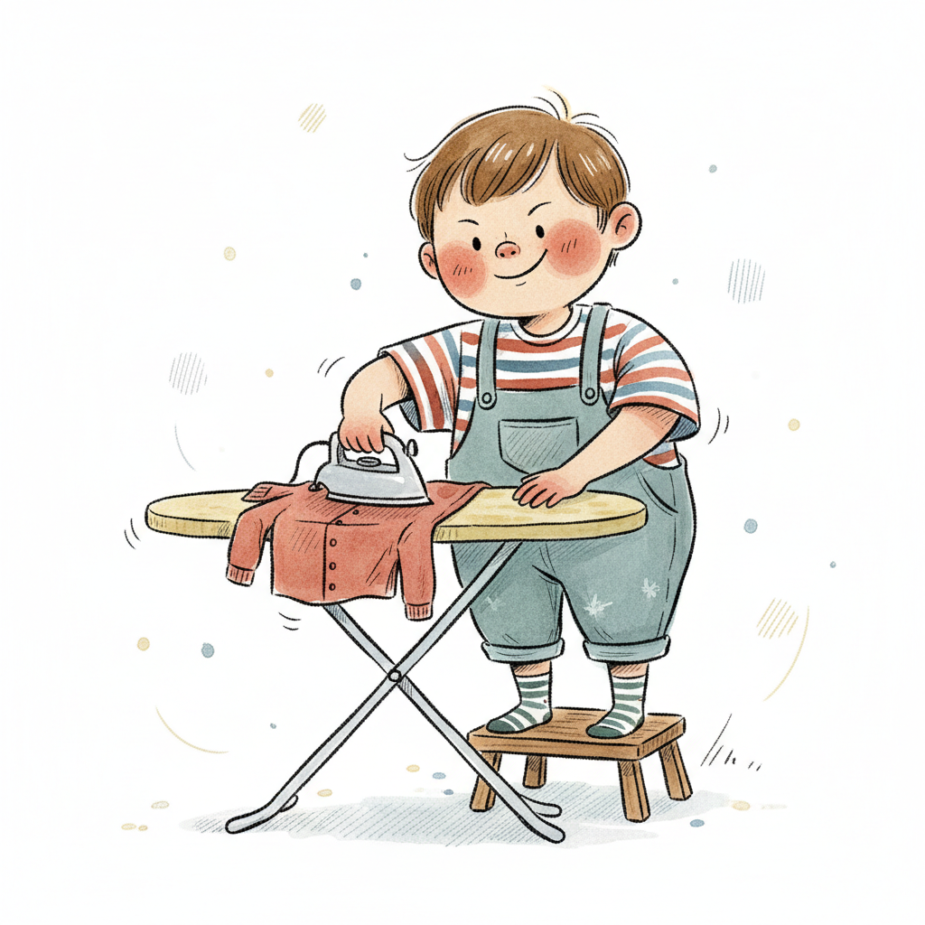 Ein lächelnder Cartoon-Junge bügelt ein rotes Hemd auf einem Bügelbrett, auf einem Hocker stehend.
