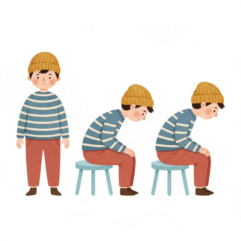 Ein Cartoon-Junge demonstriert verschiedene Körperhaltungen: stehend, sitzend mit guter und schlechter Haltung.