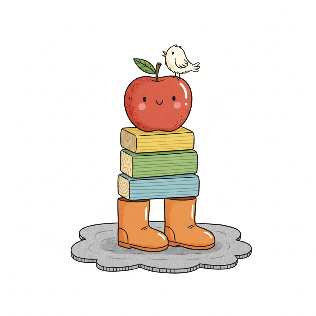 Niedliche Illustration: Apfel mit Vogel auf Bücherstapel und Stiefeln, stehend auf einer Wolke.