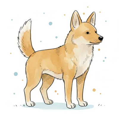 Illustration eines stehenden, hellbraunen Hundes mit spitzen Ohren und buschigem Schwanz im Aquarellstil.