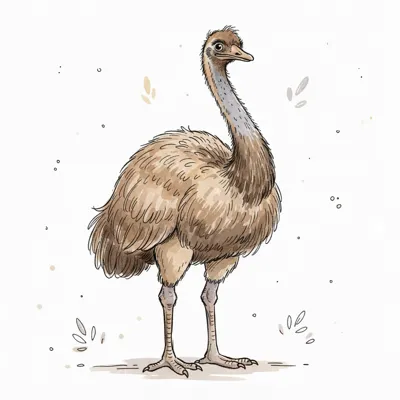 Aquarellzeichnung eines Emus mit braunem Gefieder, stehend auf weißem Hintergrund.