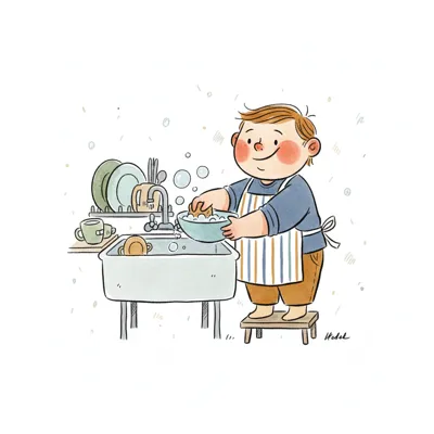 Niedliche, kindgerecht illustrierte Szene mit einem Kind oder einer Person als Hauptfigur, vor rein weißem Hintergrund, im frech-nordischen Aquarell-Skizzenstil. Klare, leicht wackelige Tuschekonturen, sichtbare Pinsel- und Strichtextur, dezente Schraffuren, weiche handgemalte Farbflächen in gedeckten Farben. Einfache, runde Formen. Keine harten Schatten, sondern sanfte, transparente Aquarellschichten. Leicht raue, handgezeichnete Linien statt glatter Vektorkanten. Subtile, vereinzelte Kritzelpunkte oder kleine Details im Hintergrund (wie Pünktchen oder feine Striche), aber keine echte Umgebung oder Landschaft. Die Figur ist mittig zentriert. Insgesamt charmant, humorvoll, warm und handgemacht wirkend. WICHTIG: Das Bild darf ABSOLUT KEINEN TEXT, KEINE BUCHSTABEN und KEINE ZAHLEN enthalten.