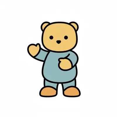Niedlicher Cartoon-Bär in blauem Schlafanzug winkt und zeigt auf weißem Hintergrund.