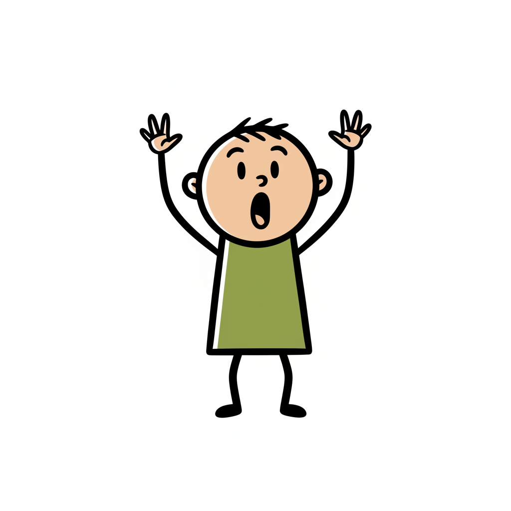 Strichmännchen mit offenem Mund und erhobenen Händen, Ausdruck von Überraschung oder Schock.