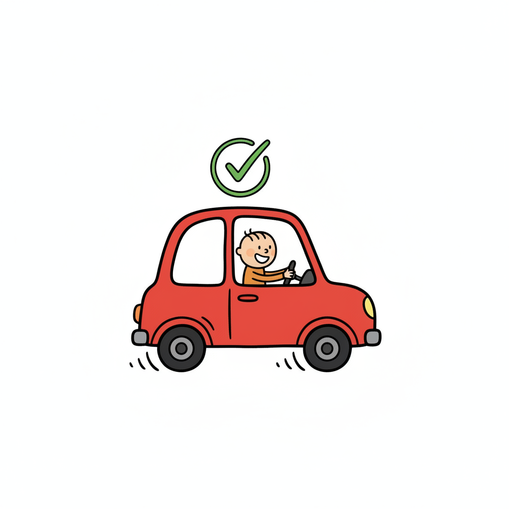 Ein lachender Strichmännchen-Fahrer in einem roten Cartoon-Auto mit grünem Häkchen darüber.