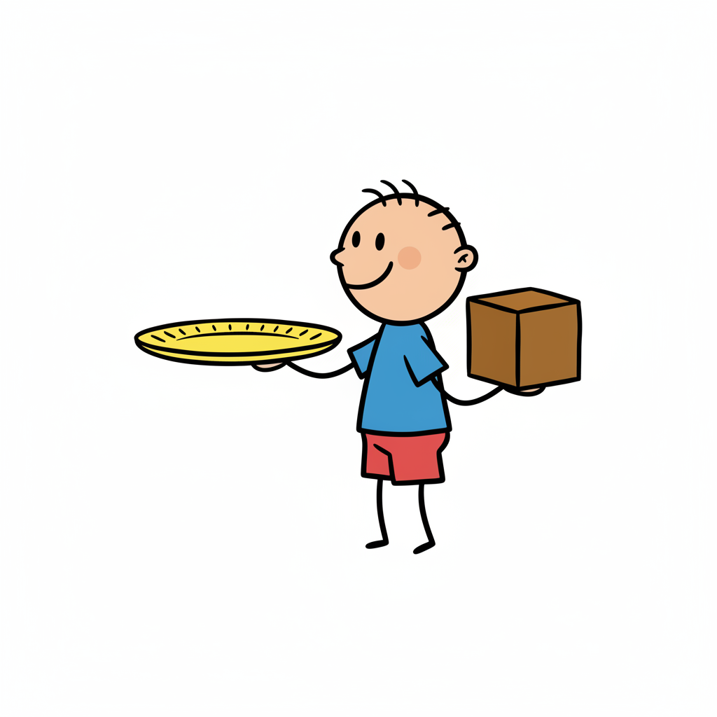 Fröhliches Strichmännchen-Kind balanciert einen gelben Teller und eine braune Box.