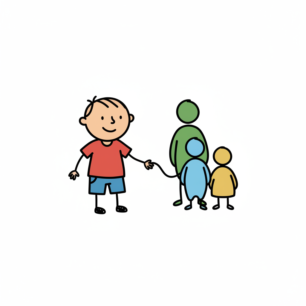 Strichmännchen: Junge hält Händchen mit einer Familie aus drei weiteren Figuren.