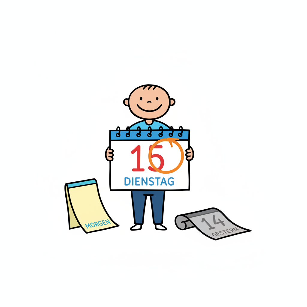 Strichmännchen hält Kalenderblatt "15 Dienstag", umgeben von "Morgen" und "Gestern".