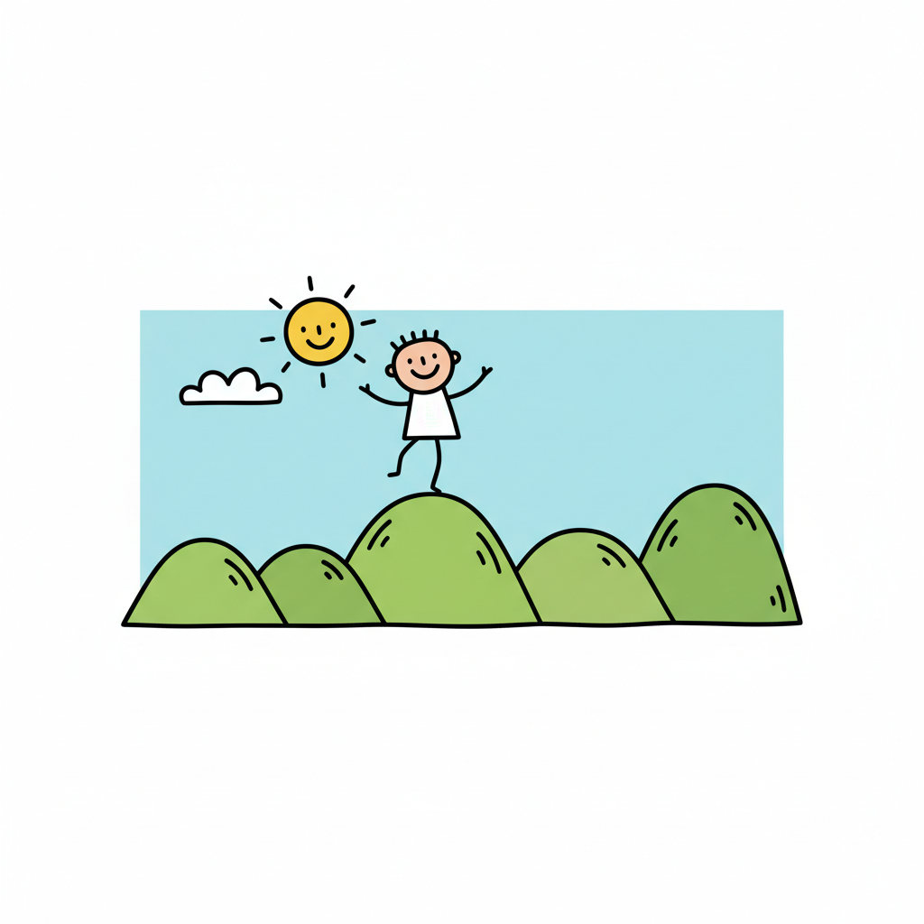 Fröhliches Strichmännchen auf einem grünen Hügel unter lachender Sonne und Wolke.