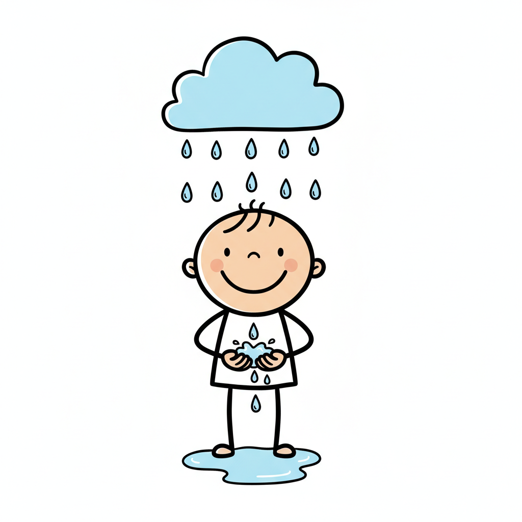 Fröhliches Strichmännchen-Kind fängt Regenwasser in den Händen, Wolke regnet.