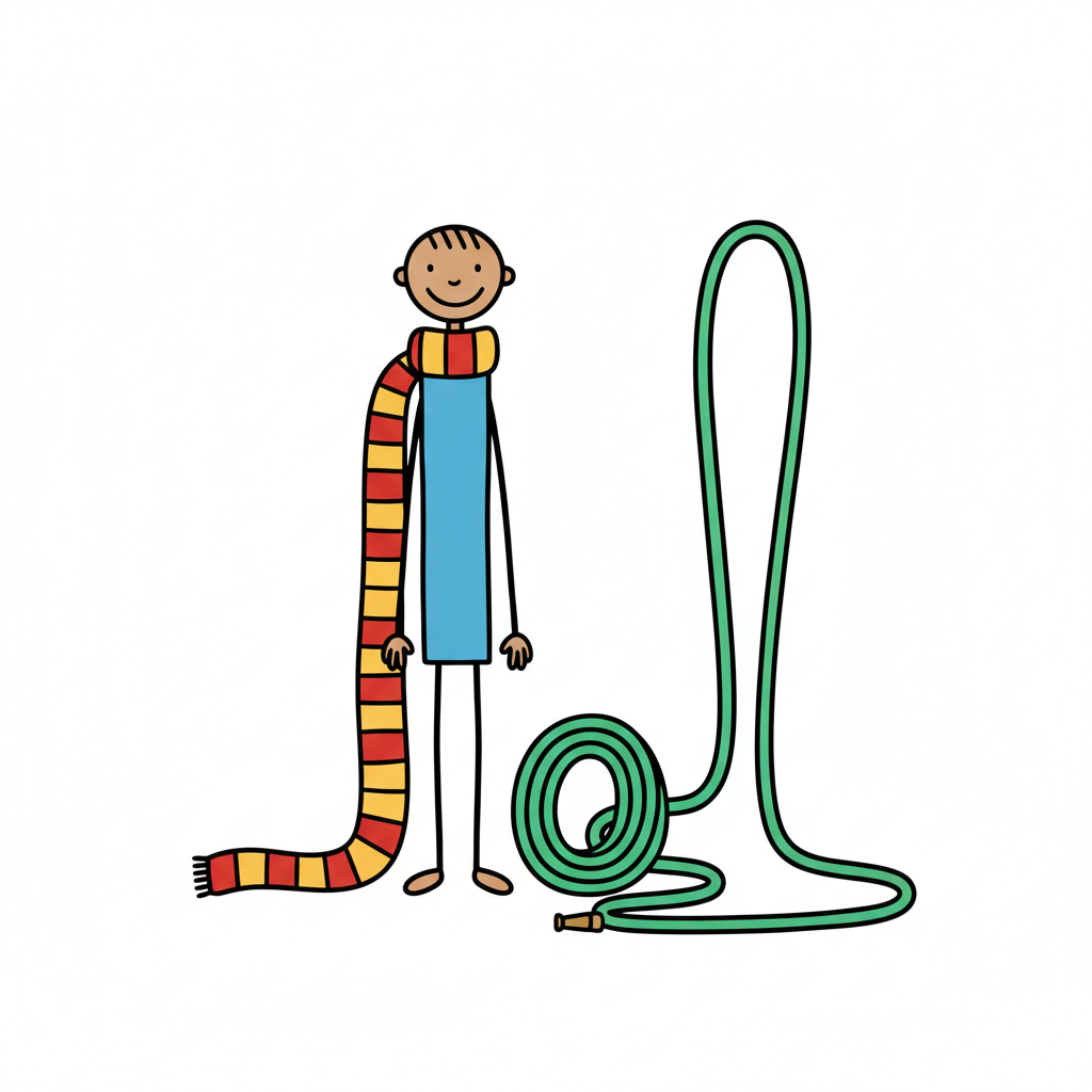 Ein lächelndes Strichmännchen mit langem Schal steht neben einem grünen Gartenschlauch.
