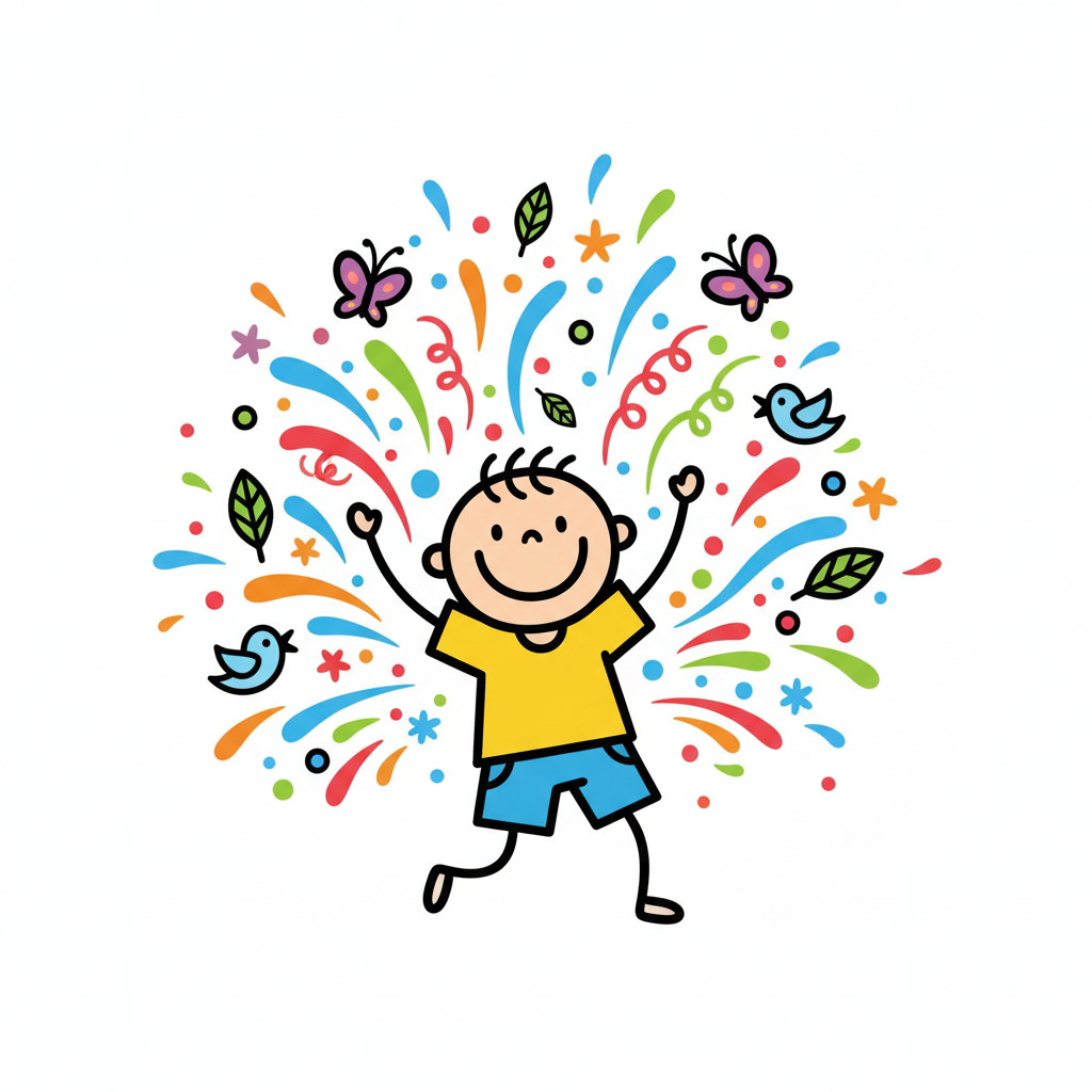 Fröhlicher Strichmännchen-Junge umgeben von bunten Konfetti, Schmetterlingen und Vögeln.