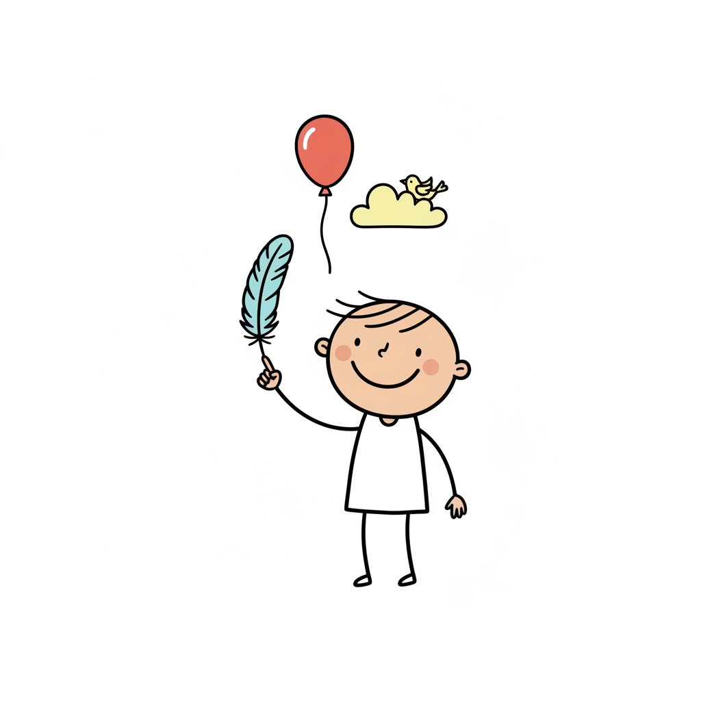 Glückliches Strichmännchen mit Feder, Ballon, Wolke und Vogel, das Leichtigkeit und Kreativität darstellt.