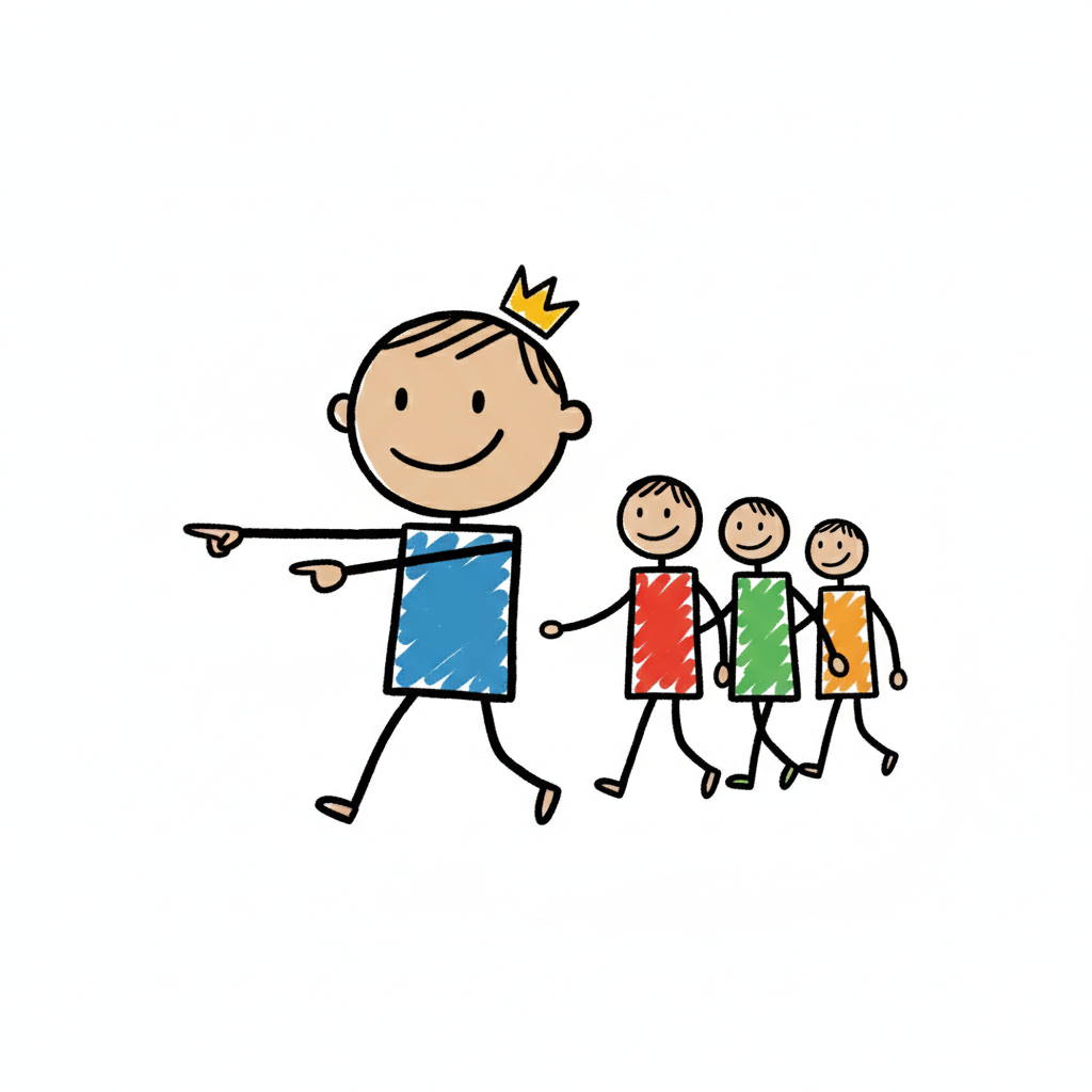 Gekröntes Strichmännchen führt drei kleinere Strichmännchen, die ihm folgen.