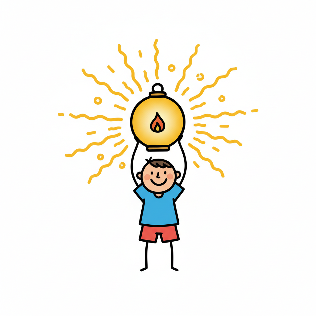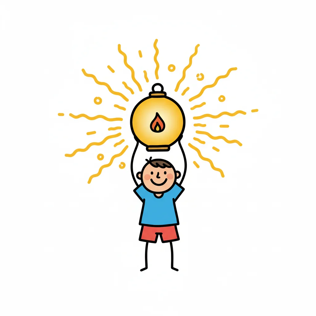Fröhliches Strichmännchen-Kind hält eine hell leuchtende Laterne über dem Kopf.