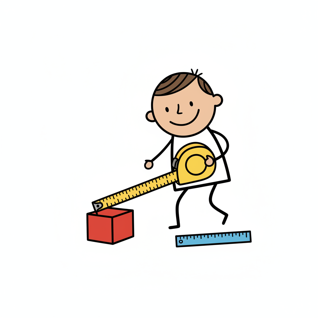 Ein fröhliches Strichmännchen misst einen roten Würfel mit einem gelben Maßband. Ein Lineal liegt bereit.