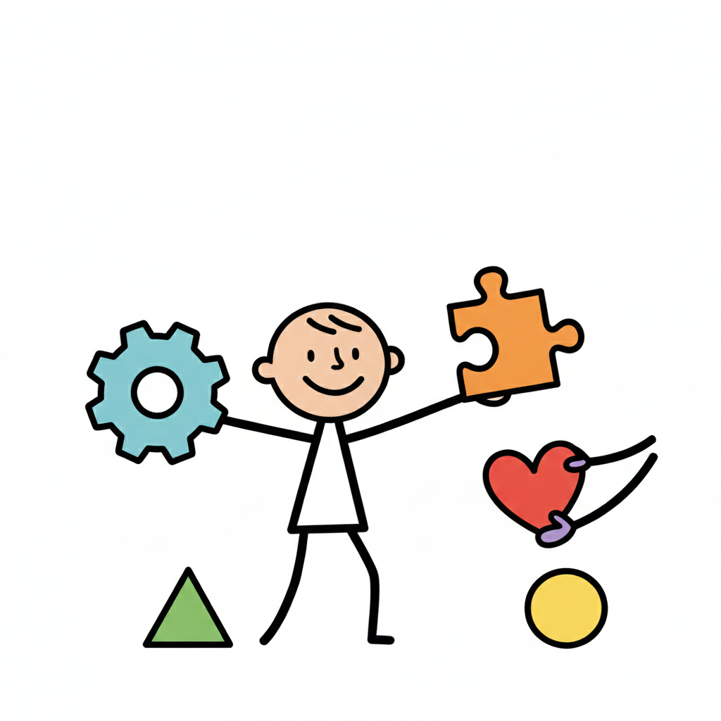 Strichmännchen hält Zahnrad und Puzzleteil. Formen und Herz symbolisieren Logik, Kreativität und Emotion.