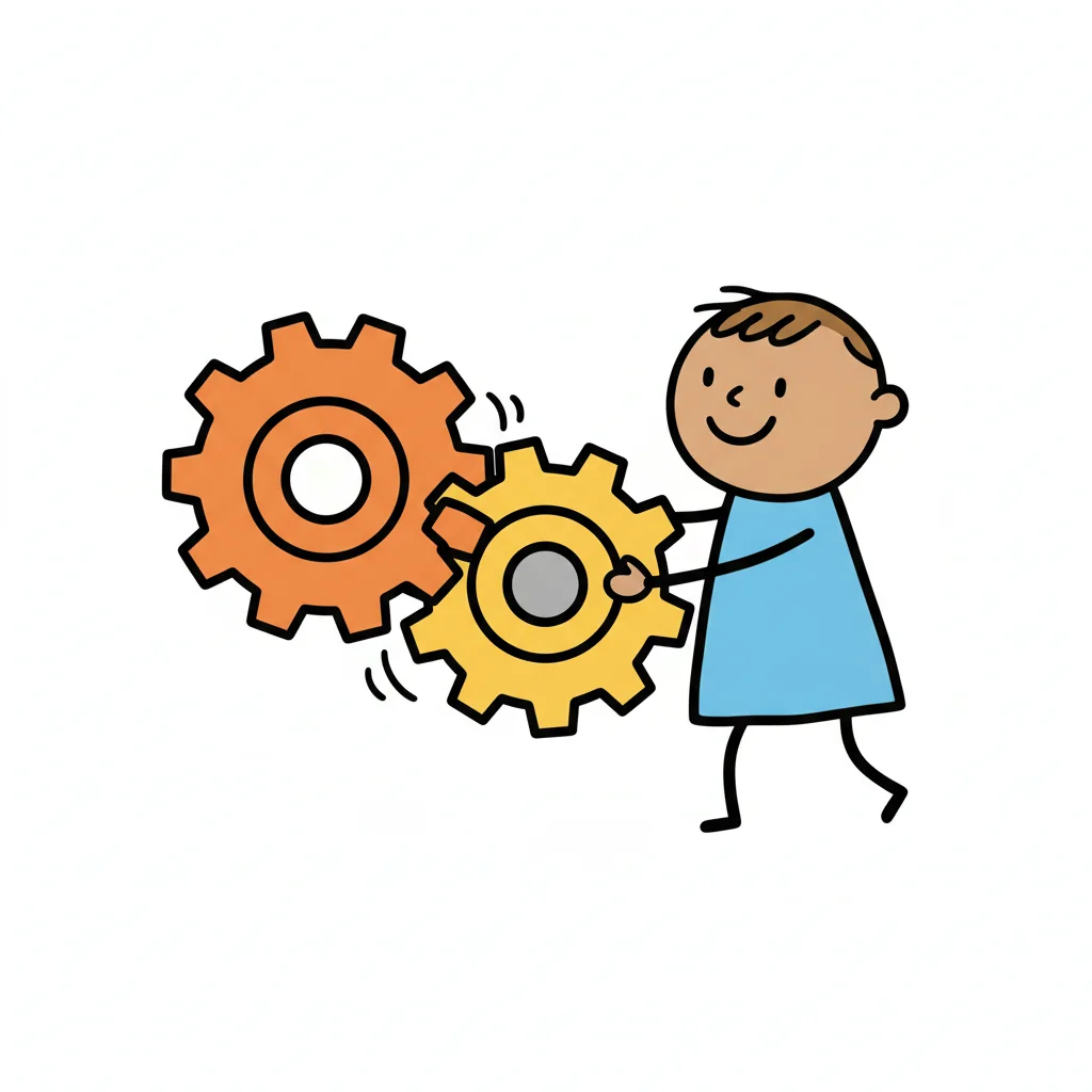 Ein lächelndes Strichmännchen bewegt zwei ineinandergreifende Zahnräder.