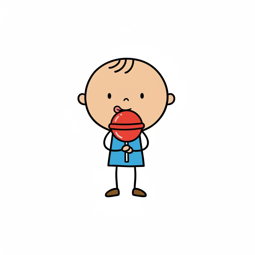 Ein niedliches Strichmännchen-Kind leckt einen roten Lutscher.