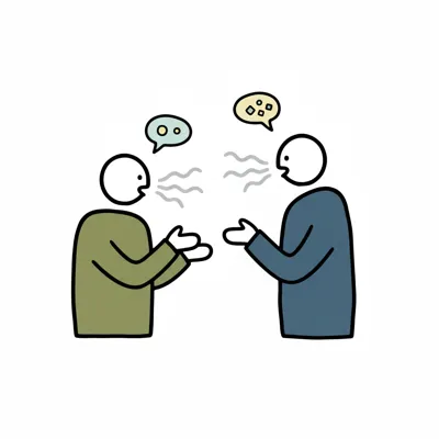 Zwei Strichmännchen unterhalten sich mit Sprechblasen und Wellenlinien, die Kommunikation andeuten.