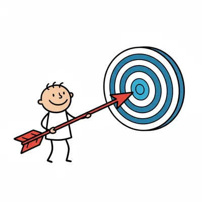 Ein lächelndes Strichmännchen hält einen Pfeil, der genau ins Schwarze einer Zielscheibe trifft.