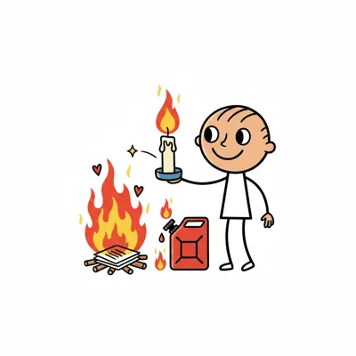 Strichmännchen mit Kerze entfacht Feuer aus Papieren und Benzinkanister.