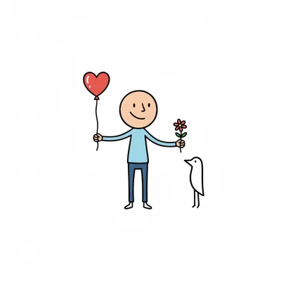Fröhliche Figur mit Herzballon und Blume, die einem kleinen Vogel angeboten wird.