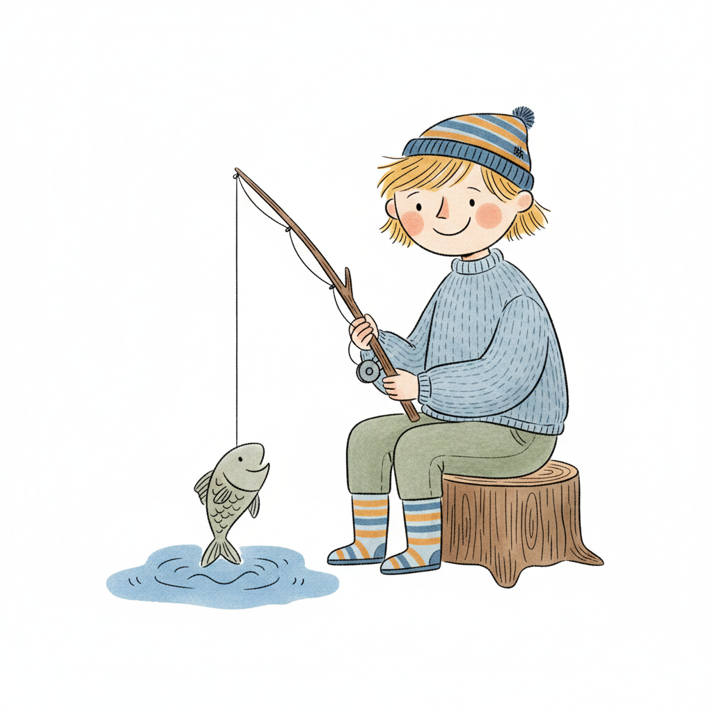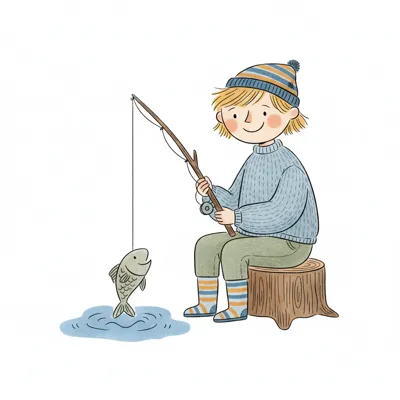 Glückliches Kind mit Mütze angelt und hat einen Fisch am Haken. Sitzt auf einem Baumstumpf.