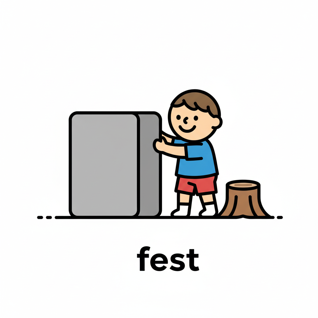 Cartoon-Junge schiebt Block. Daneben Baumstumpf. Wort "fest" unten.