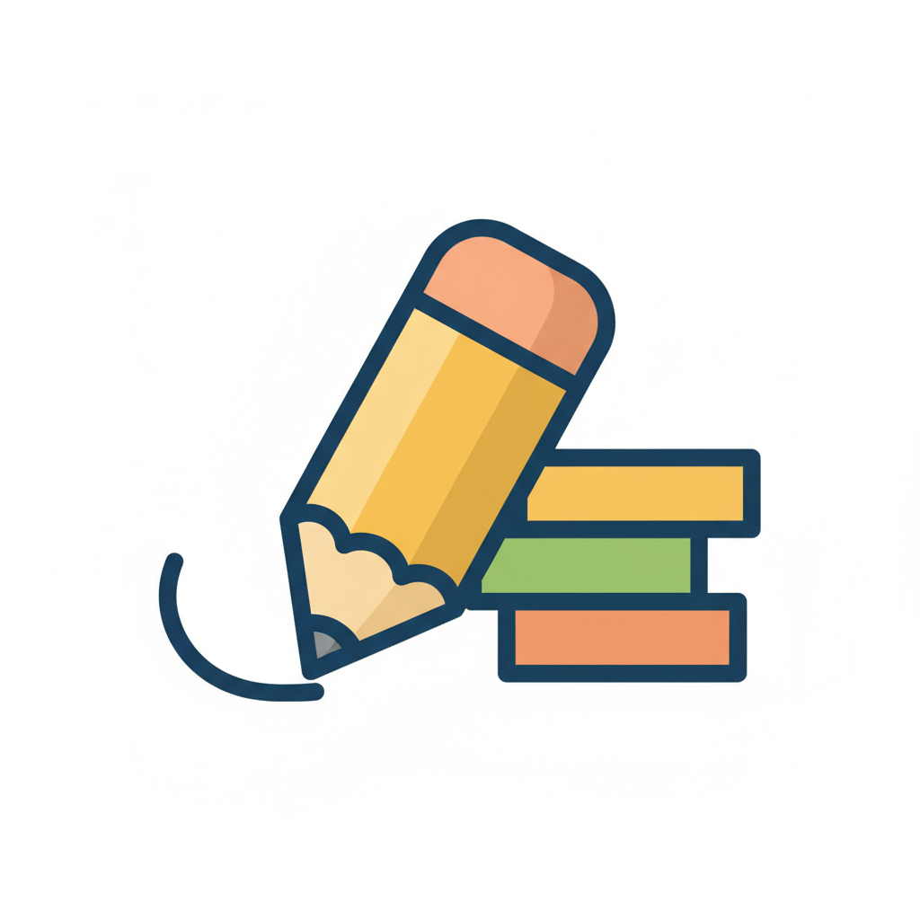 Buntes Icon: Ein Bleistift zeichnet eine Linie neben einem Stapel Bücher oder Notizbücher.