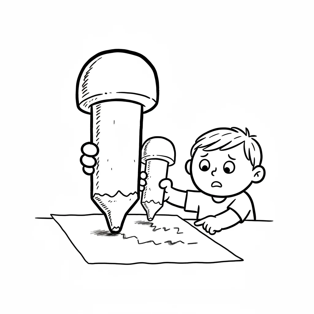 Junge zeichnet mit Bleistift, daneben riesige Hand mit riesigem Stift. Er wirkt überfordert.